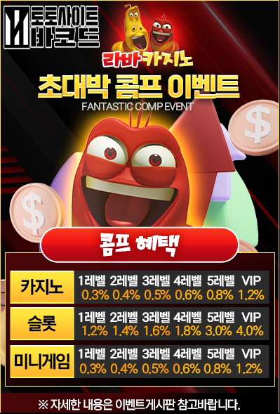 라바카지노는 다양한 이벤트와 풍성한 혜택을 통해 게임의 즐거움을 한층 더 높이고 있습니다. 특별 보너스와 프로모션을 통해 색다른 재미와 만족을 경험하실 수 있습니다.